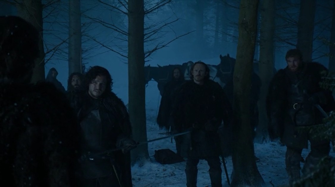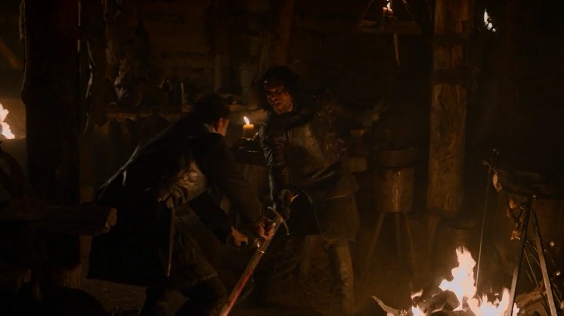 Muy cerca de ahí, Jon se enfrenta a Karl, y aunque Karl opone mucha resistencia, Jon finalmente consigue matarlo con la ayuda de una de las mujeres de Craster, que le echa una mano (más bien un cuchillo a la espalda de Karl). El único que ha quedado libre de los amotinados es Rast, al que Fantasma da lo suyo en breves momentos.
