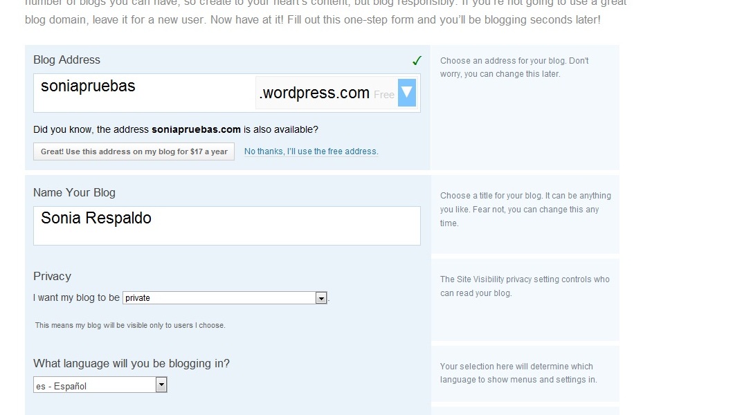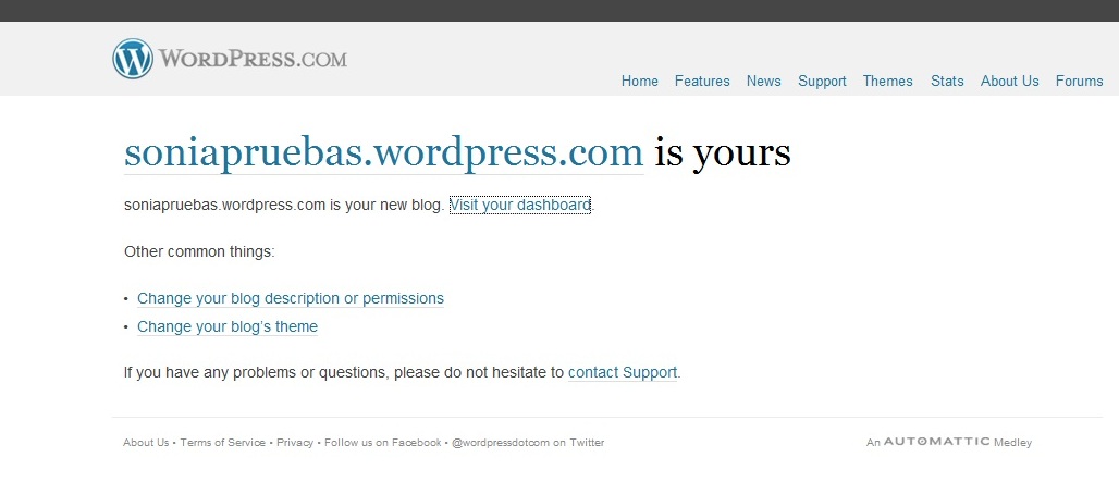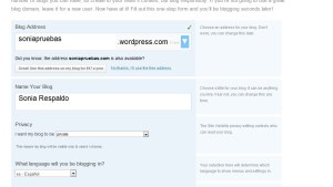 Entonces, creamos un blog, con la URL que elegimos y el título que elegimos (luego se pueden cambiar ambos atributos, desde Ajustes-Generales y desde el escritorio donde se ven todos nuestros blogs)