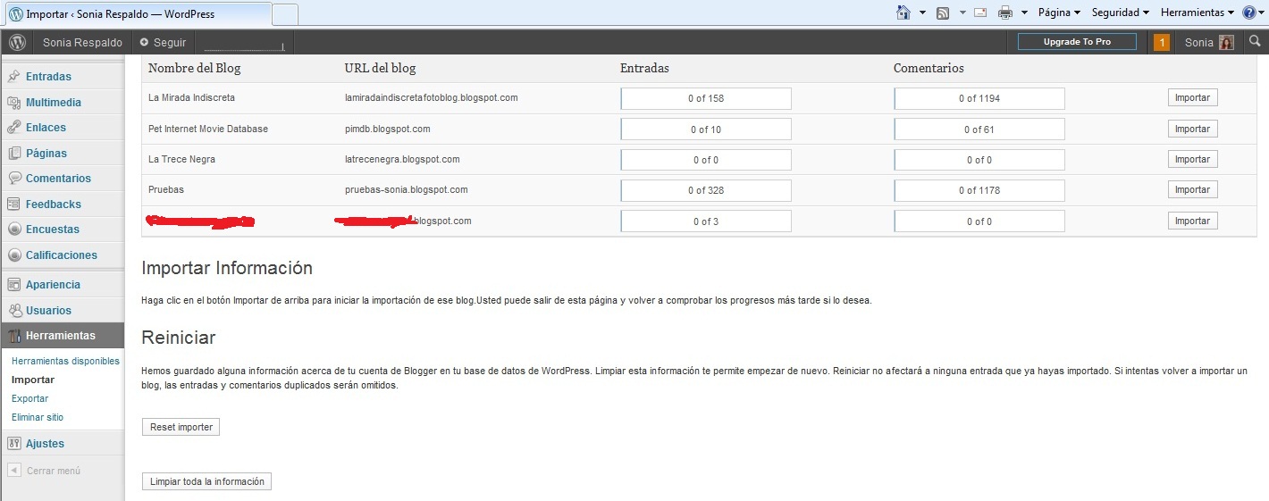 5. Yo ya tuve que «migrar» por obligación a wordpress, menos mal que tenía la copia de seguridad. La verdad, ni me he molestado en mirarlo mucho, porque lo único que quería era tener el blog accesible, pero igual me animo a trastear y arreglar las entradas que están descojonadas.