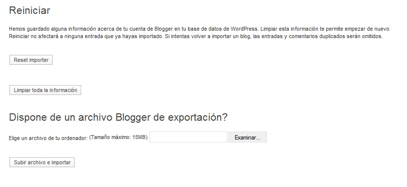Al seleccionar Blogger, y si estamos logueados en el navegador, el sistema reconoce los blogs que allí tenemos. En mi caso y como lo tenía borrado cuando hice el traslado, subí directamente mi copia de seguridad. Así que el método 1 sería simplemente darle a uno de esos botones que ponen «Importar» (ya digo que este no lo he probado)