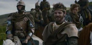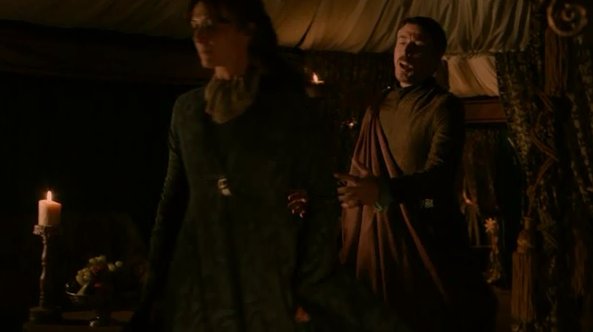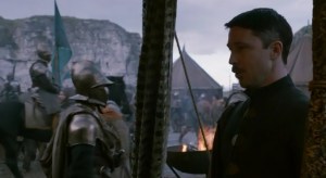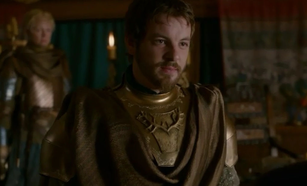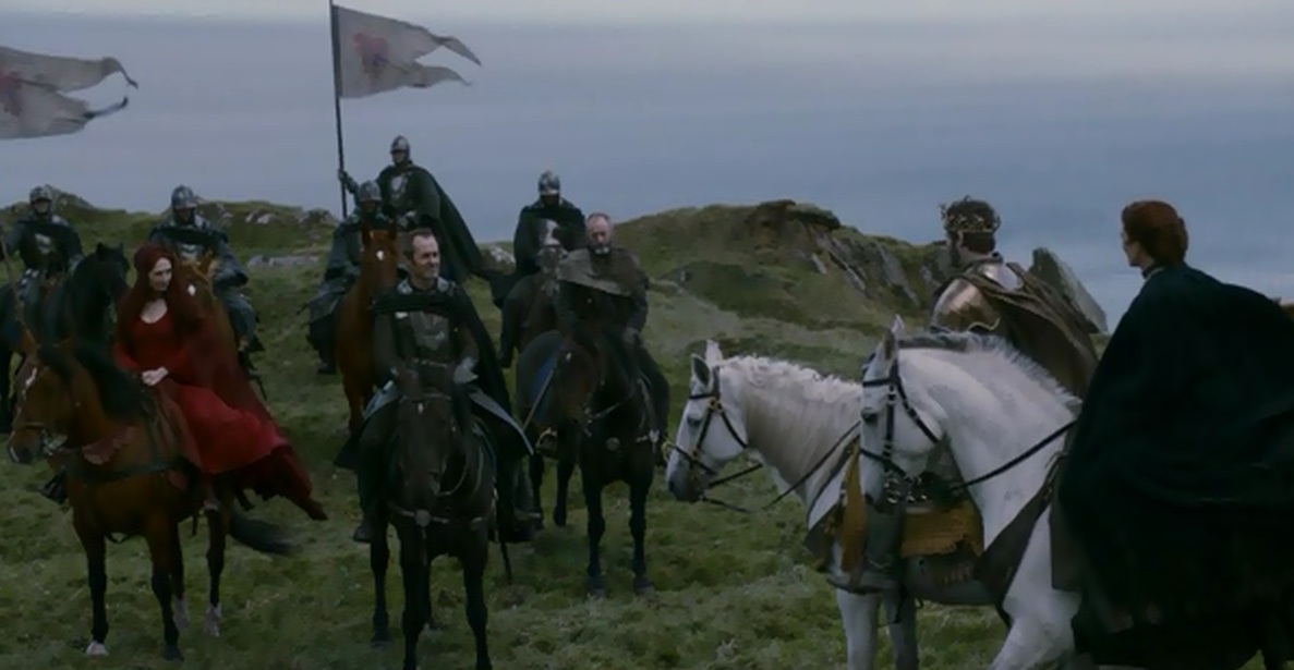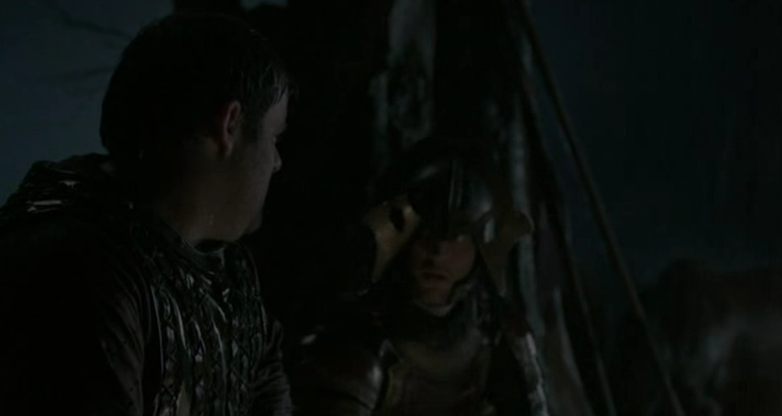 Y pasamos de nuevo al campamento de Renly, para presenciar el «fraternal» encuentro con su hermano Stannis, el «soso», que se ha acercado a hacer una visita, darle un ultimatum y esas cosas. Vamos, que si en el transcurso de ese día no dobla la rodilla ante él, lo considerará un enemigo. Renly se siente arropado por la gente y lo bastante seguro como para disputarle el derecho al trono a su hermano mayor, así que le dice más o menos y más finamente, que se vaya a tomar por saco. Catelyn intenta interceder y reconciliarlos, pero bueno, ya sabemos que Catelyn no suele conseguir mucho con sus argumentos «buenistas» en plan sois hermanos y no os podéis llevar así de mal. Así que ahí queda ese ultimatum, si Renly no le muestra su rendición a Stannis, este lo tomará como un contendiente más por el Trono de Hierro, y un enemigo.