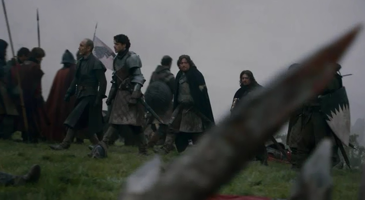 Pues bueno, vamos al lío. Empezamos el capítulo con una escena de dos guardias random del bando Lannister, que tienen una charla random también hasta que algo altera su guardia nocturna: una sombra que inquieta a los caballos. En realidad se trata de un ataque sorpresa del ejército de Robb, el Rey en el Norte, que viene precedido por el huargo de Robb, Viento Gris.