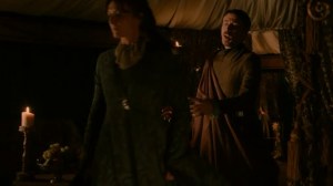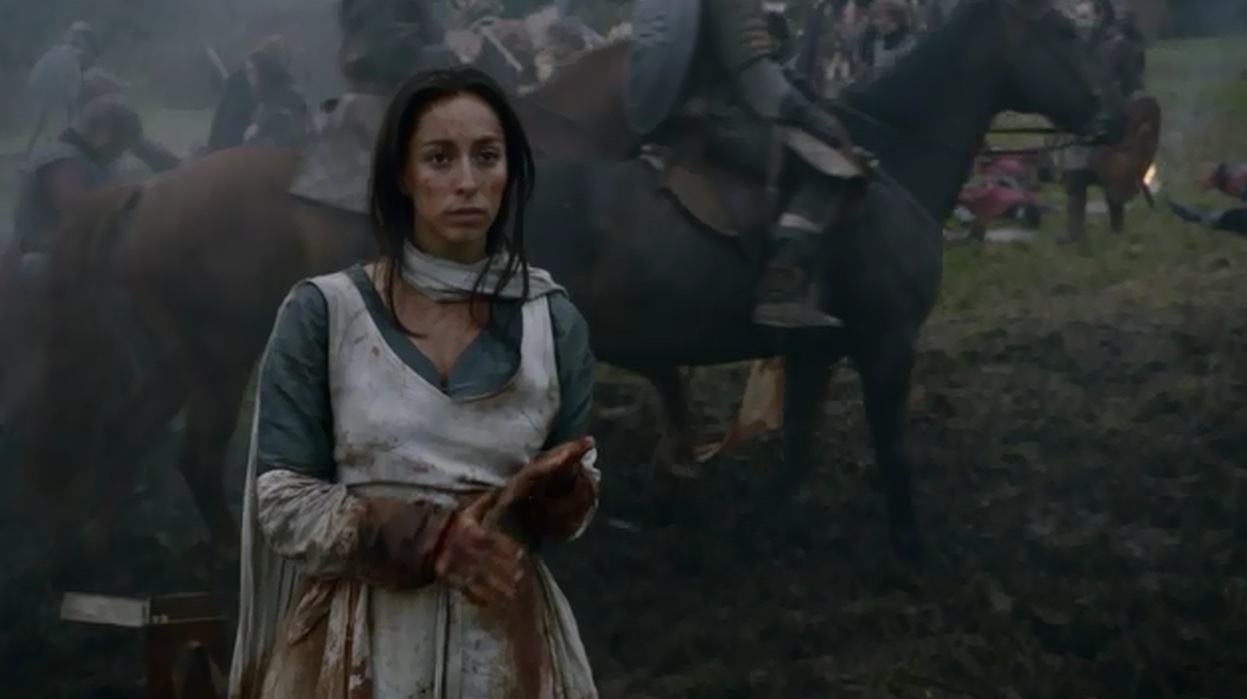 No entramos mucho en detalles en lo de la batalla, y en la siguiente escena de repente estamos en el escenario «post ataque sorpresa». Cuando Robb conoce a una especie de curandera, mantienen una conversación sobre por qué están en guerra y si tiene sentido que sufran sus consecuencias los que no tienen culpa (personificados en un soldado que pierde la pierna). El personaje dice llamarse Talisa, y dice venir de Volantis. Ya sabemos que ese no es su verdadero nombre, supongo que los guionistas han querido jugar aquí un poco al despiste. De todos modos, visto lo visto hasta ahora, Oona Chaplin me parece una elección estupenda para el papel de «Talisa».