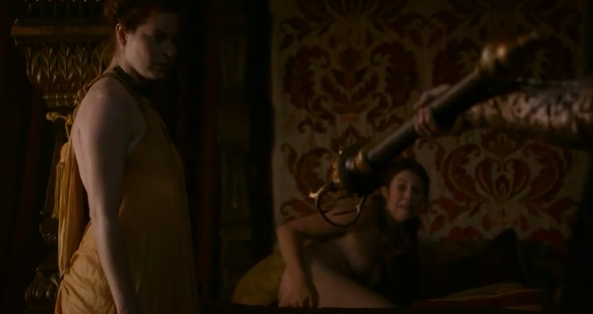 En un momento posterior, Bronn, que se las sabe todas, sugiere a Tyrion que todos estos problemas pueden ser debidos a que Joffrey se aburre, y que él podría entretenerlo de alguna manera. ¿Y cómo le entretiene? Pues como con algo que Tyrion domina muy bien, enviándole un par de pilinguis. En el momento de la verdad, tampoco parece que sea lo que más le gusta a Joffrey, en principio el «niño» no parece muy inclinado a conformarse con sexo normal sino que le pone algo más duro y violento. Así que protagoniza junt a las dos putas una escena la mar de grotesca (y tenías razón, Unai, recuerda mucho al encuentro de Patrick Bateman en American Psycho) y violenta. ¡Que tiemblen las putas de Desembarco del Rey! ¿Creéis que están cargando demasiado las tintas en lo muy malo que es?