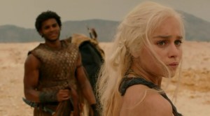 Y vamos al otro lado del Mar Angosto, con la comitiva de Daenerys y compañía. Se agradece que recorten tiempo en pantalla de esa parte, ya que de momento no pasa casi nada, aparte de que van medio muertos de cansancio por el desierto, se les mueren los caballos, van probando en una y otra ciudad, etc. De esta escena sale el título del capítulo, Jorah dice que a Qarth la llaman «jardín de huesos». Cada vez que en la ciudad rechazan a alguien que quiere entrar, el jardín crece.