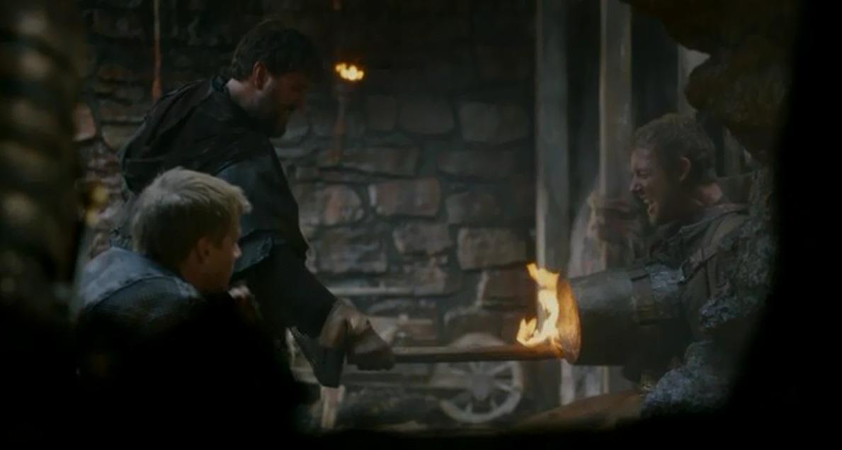 También presenciamos lo que es la rutina en Harrenhal. Cada día escogen a una persona a la que torturar. Y de eso se encarga el torturador oficial, Cosquillas. Veremos que tiene un creactivo método para hacer hablar a los que interroga.