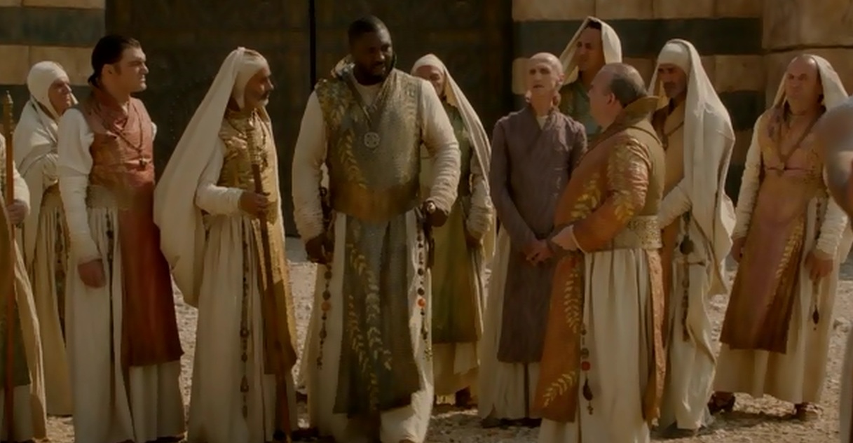 Aquí vemos a Xaros Xhoan Daxos (Nonso Anozie) por primera vez, que responde por el khalasar para que puedan entrar. Esto quiere decir que se acoge a una especie de trato, según el cual se hace responsable de esa gente mientras estén en la ciudad.