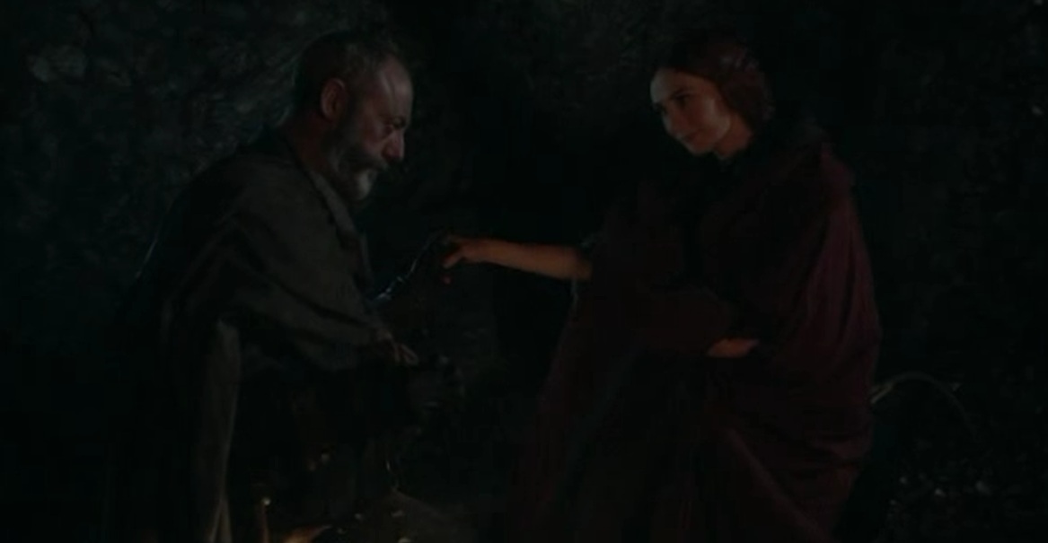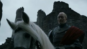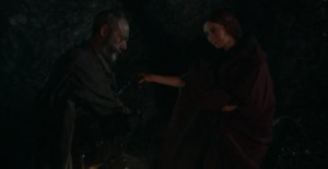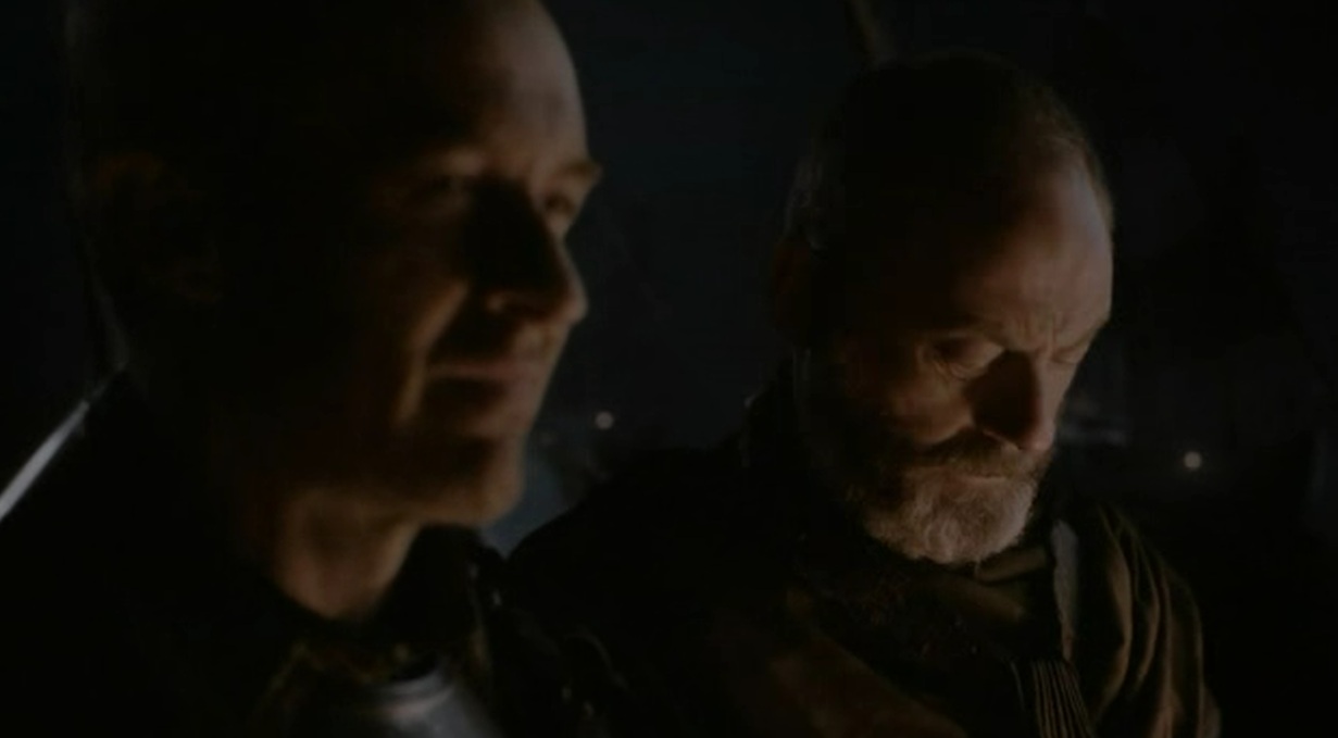 Y luego pasamos a casi la última escena. Una conversación donde se pone de manifiesto lo muy mediocre – en mi opinión, claro – que es el actor que interpreta a Stannis (lo siento, Stephen Dillane, pero no me convences ni un poco) y lo brillante que es Davos (Liam Cunningham es de mis favoritos ya de la serie)… Ahí hablan del famoso saquito que lleva Davos, de cómo establecieron su curiosa relación, y es un diálogo bastante clarificador sobre qué mueve a cada uno y sus personalidades. Stannis le pide en esta escena que lleve a Melisandre a escondidas a la costa para que haga lo suyo.