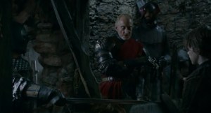 Y volvemos a Harrenhal, donde una oportunísima llegada de Tywin salva a Gendry de la tortura (ese día le ha tocado a él). Es una tremenda primera aparición en la temproada de Tywin Lannister, me ha encantado. También se da cuenta con un solo golpe de vista que Arya no es un niño como dice ser, aunque, claro está, no sabe quién es realmente.